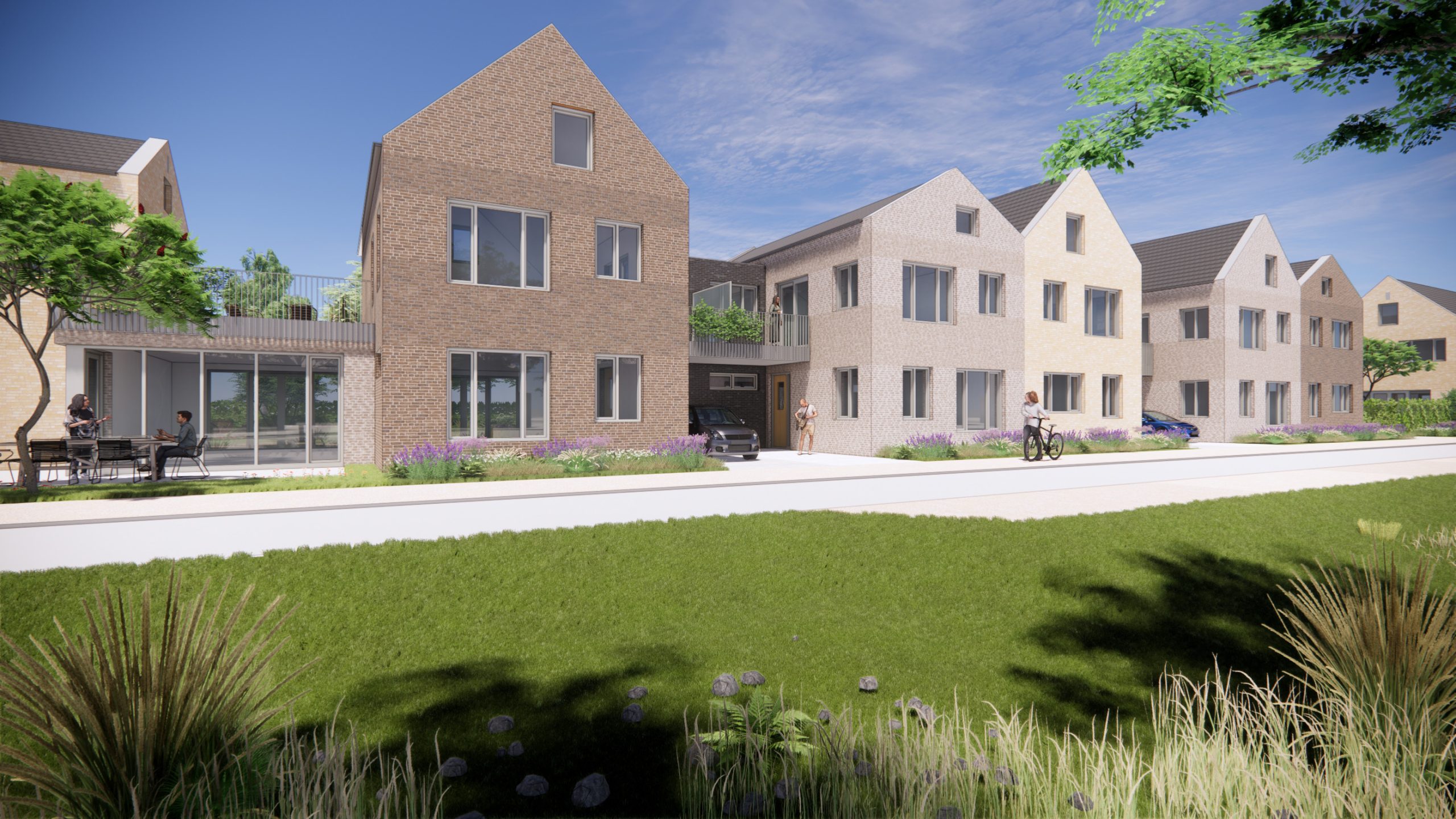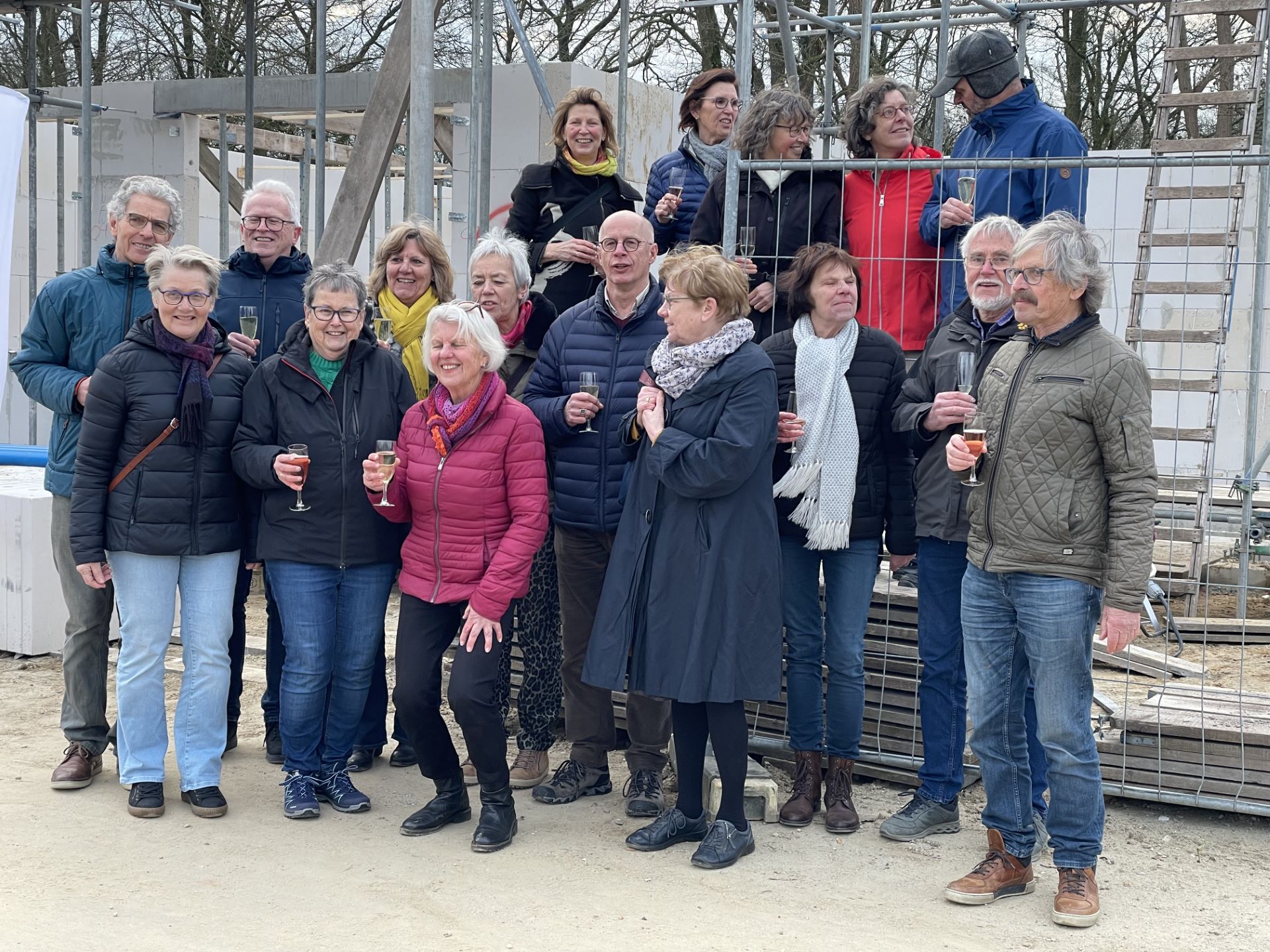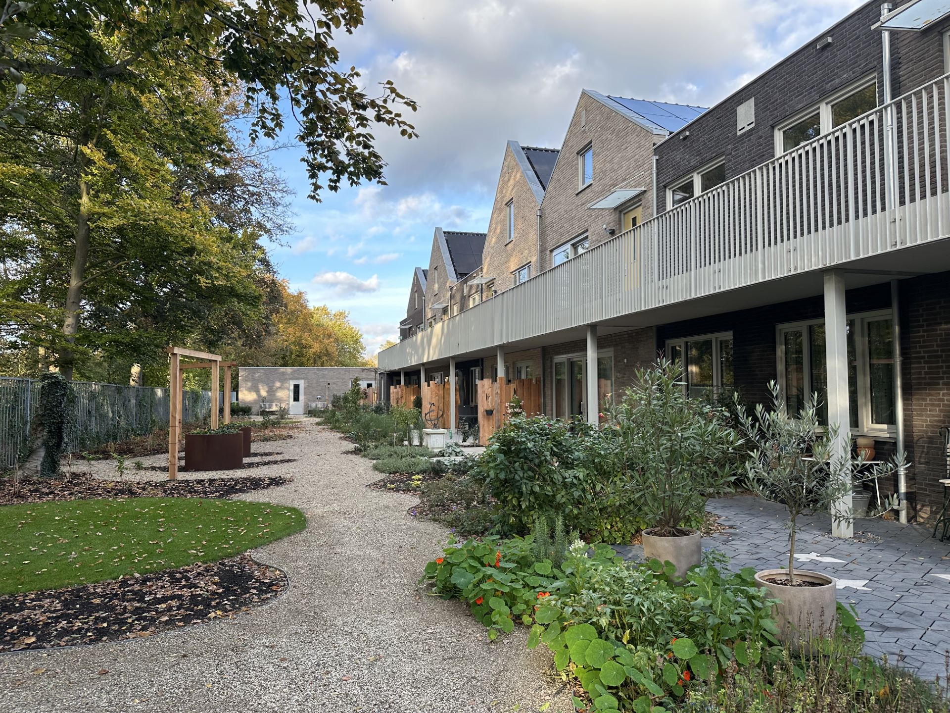 In eerste instantie zouden hier vrije kavels komen met grondgebonden woningen, vrijstaand of geschakeld. Dat type woning was niet geschikt voor de CPO-vereniging, en dus is gezocht naar een passend appartementengebouw. Vanaf de straat lijken het 8 woningen met gekoppelde garages, maar in werkelijkheid zijn het 13 gelijkvloerse appartementen en een vrijstaande woning. De galerij ligt aan de achterkant van het plan. Ieder heeft een eigen balkon of klein gedeelte van de tuin. De rest van de achtertuin delen de bewoners met elkaar; hier kunnen ze samen tuinieren waardoor ook het onderhoud gedeeld wordt. De gemeenschappelijke ontmoetingsruimte is een luchtig bouwdeel tussen de hoge bouwvolumes in. Deze vormt de verbinding tussen de buurt en de binnentuin.
