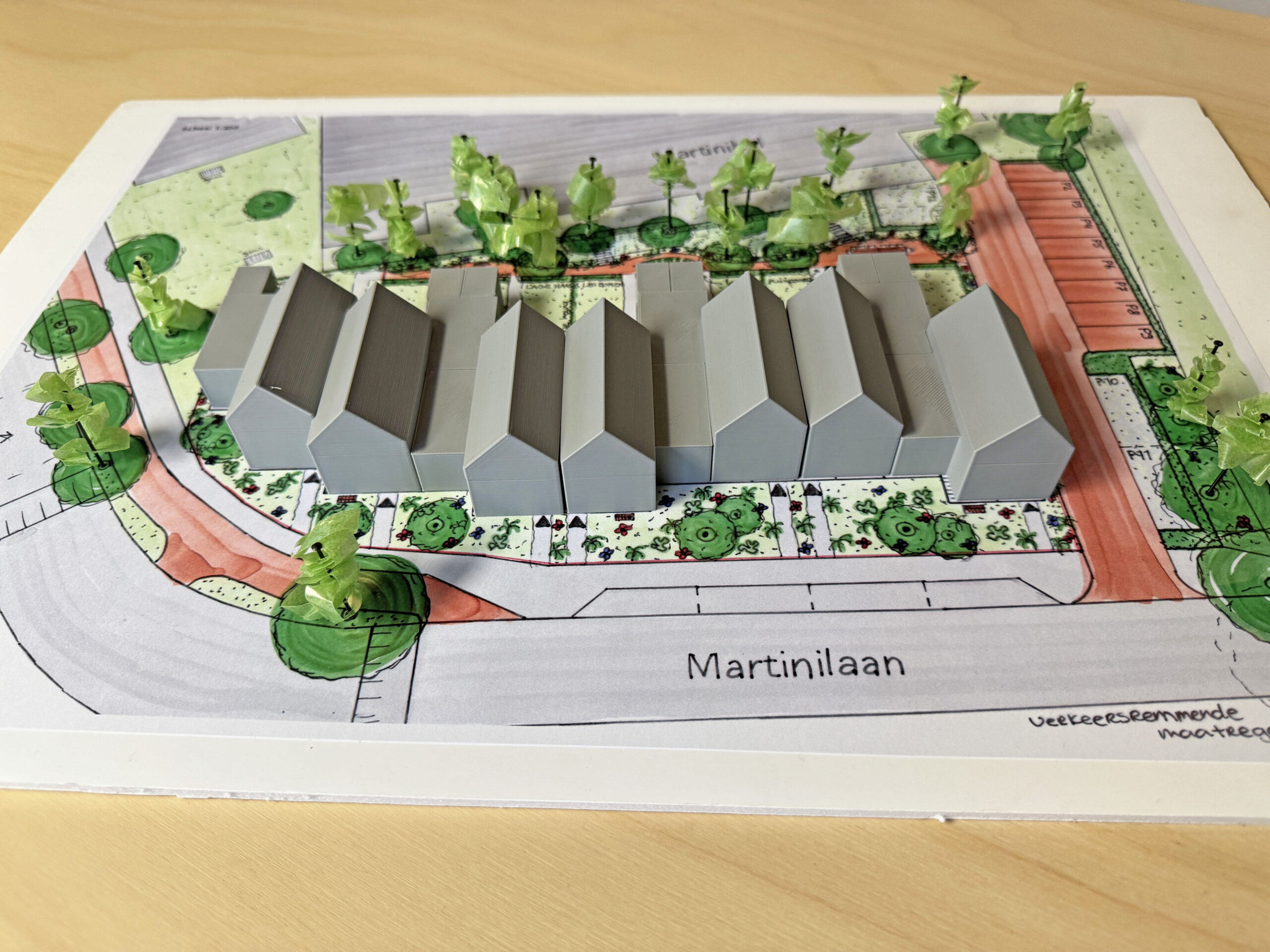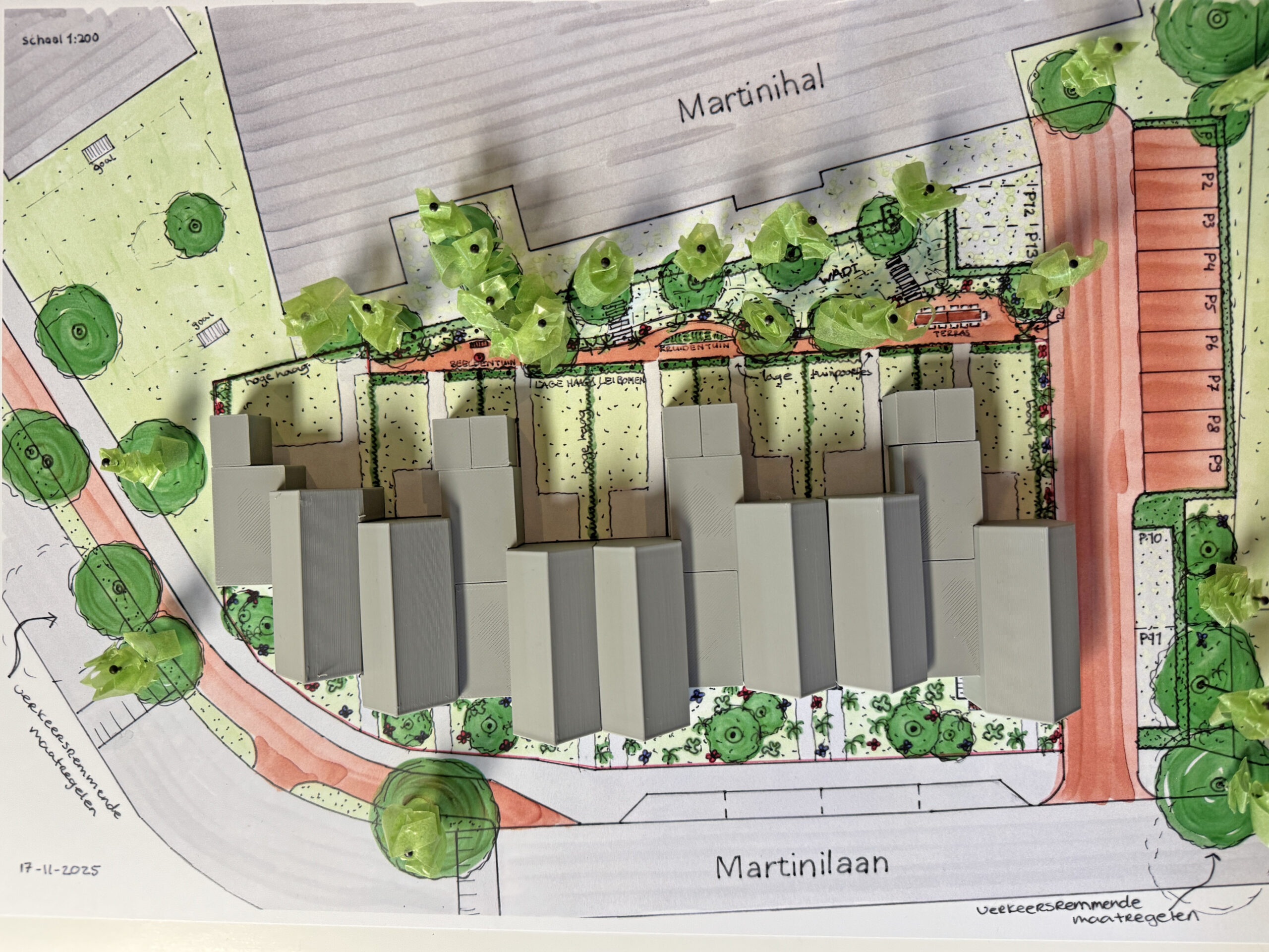 Aan de Martinilaan in Vught worden 7 levensloopbestendige woningen gerealiseerd. Door verspringende woningscheiden wanden ontstaan er bijzondere plattegronden met mooie doorkijkjes naar de omgeving. Het parkeren wordt, buiten het zicht van de woningen, in een parkeerkoffer opgelost. Naast een individuele tuin, gaan de bewoners samen met de gemeente de achterliggende groenstrook inrichten. Op deze emanier kan een gemeenschappelijk gebruik van deze strook plaatsvinden.