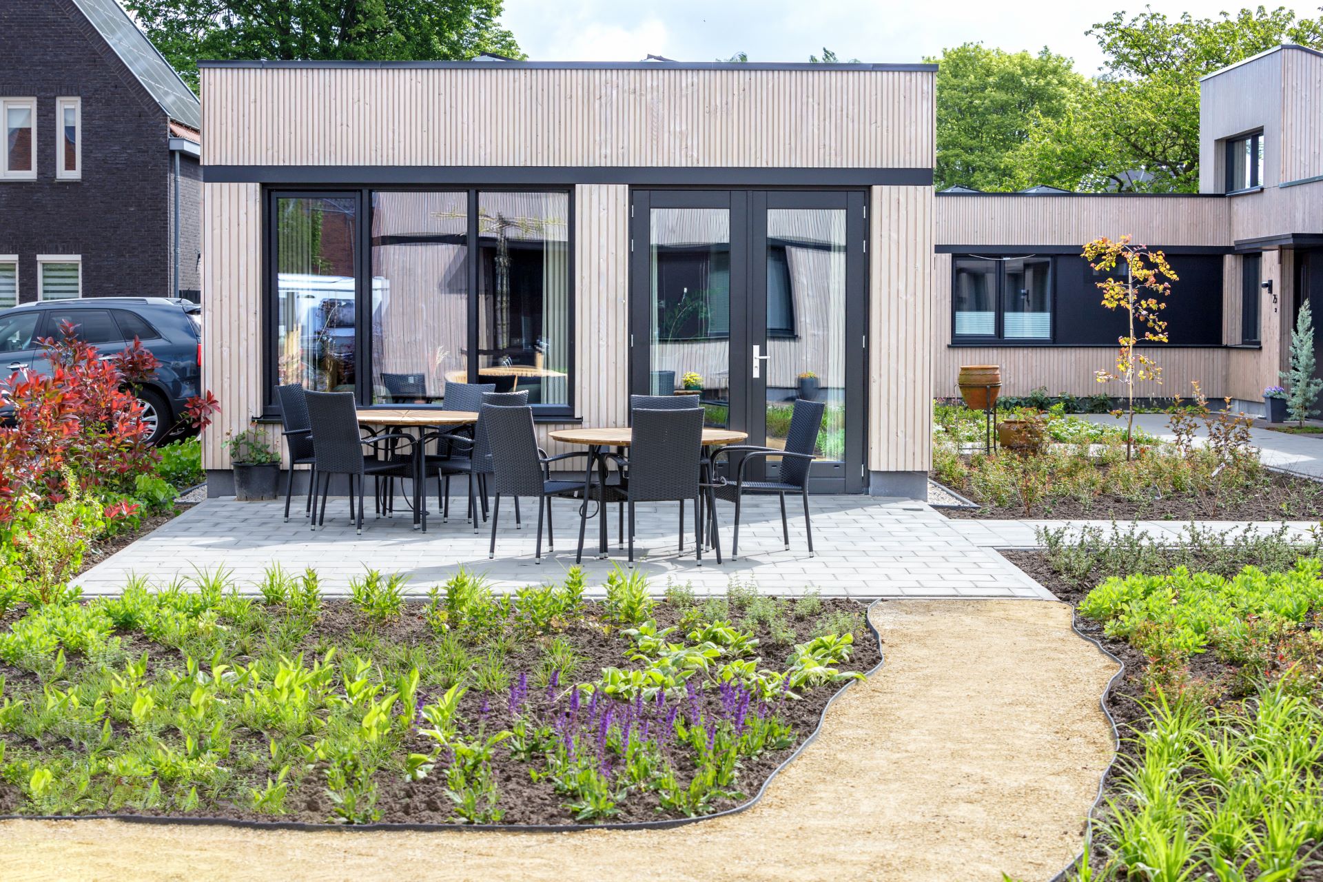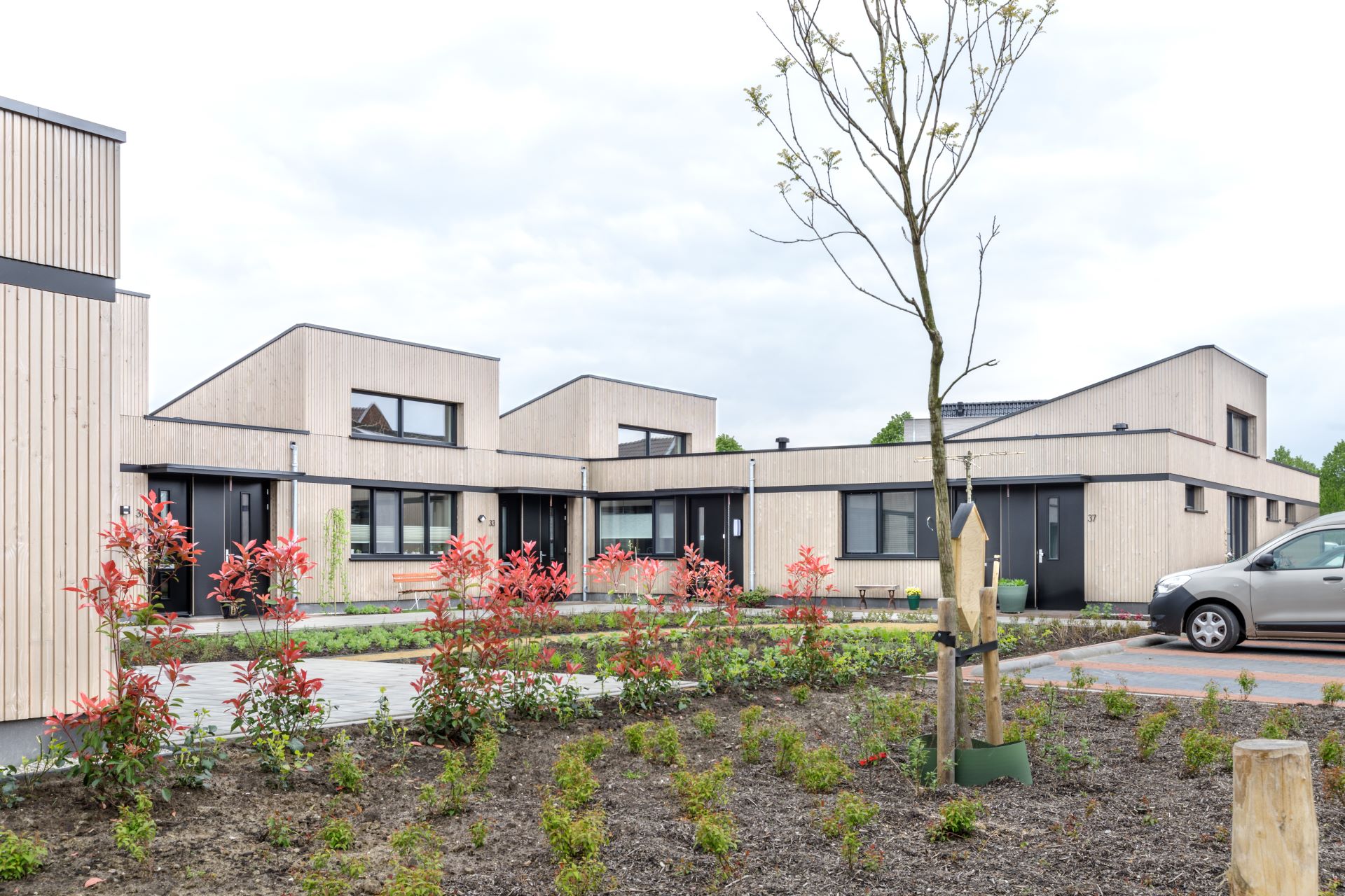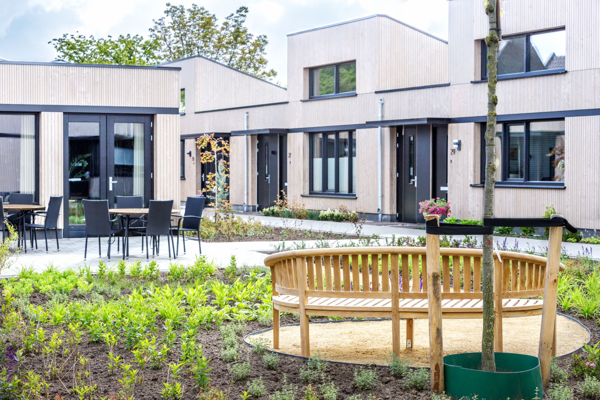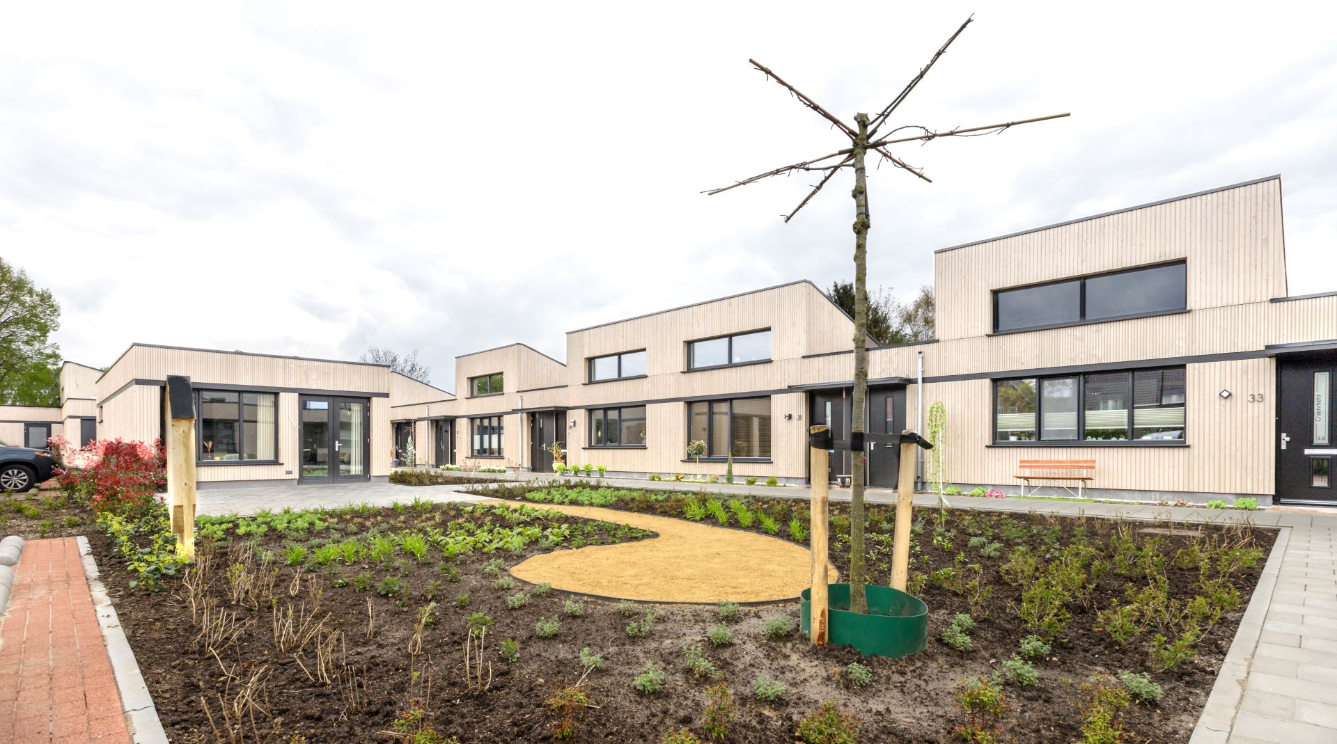 Om iedere woning een gezicht aan de binnenhof te kunnen geven grijpen de plattegronden als schakels in elkaar. Dit maakt de woningen tegelijk heel ruimtelijk, samen met de verhoogde dakopbouwen boven de woonruimte. Op een beperkt perceel staat nu een ruim aanvoelend woongebouw waar toch iedere woning zich kan onderscheiden. Aan de straat ligt de ontmoetings- en klusruimte, centraal in de binnenhof. Uniek is de bouwwijze: helemaal van houtskeletbouw, enorm duurzaam en extreem goed geïsoleerd. Zodoende is er amper verwarming nodig, ook goed voor de portemonnee.