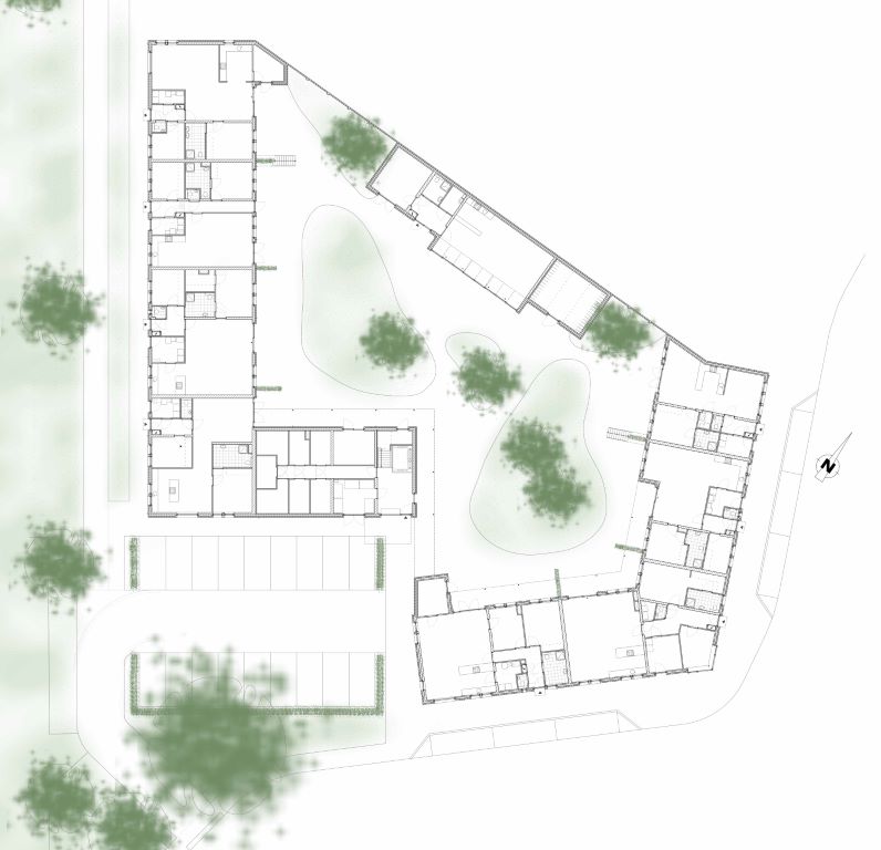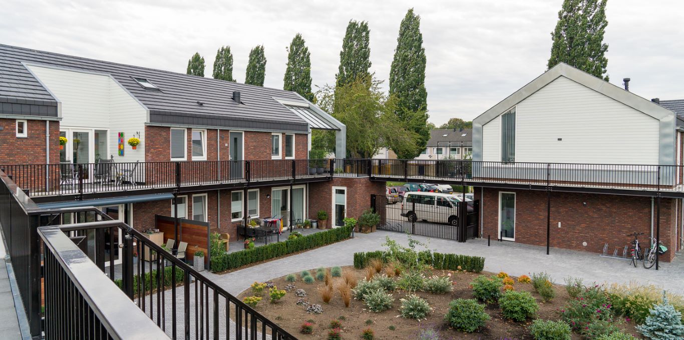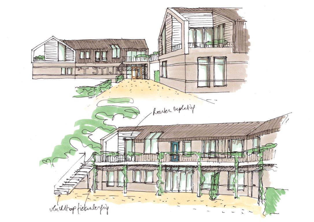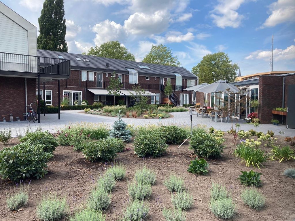 Er is gekozen voor ‘modern dorpse’ architectuur, waardoor het plan kleinschalig blijft en mooi aansluit bij de omringende bebouwing. De 15 wooneenheden liggen rondom een grote gezamenlijke binnentuin van zo’n 1000 m². Ieder appartement heeft wel een privé buitenruimte op begane grond of 1e verdieping. Centraal in de tuin liggen op het zuiden de gemeenschappelijke ruimten: grote ontmoetingsruimte, klusruimte en fietsenberging, en er is ook een logeerruimte. Met de zinken kaders op de koppen vormt het gebouw een karakteristieke verschijning.
